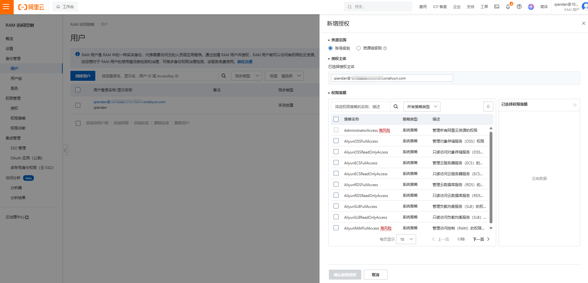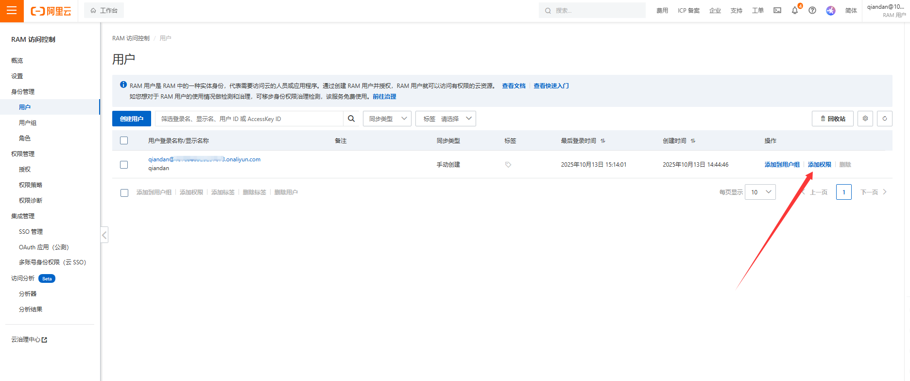 如果遇到权限不足,需要前往原账号RAM控制台补权限,具体流程身份管理-用户-点击右侧添加权限