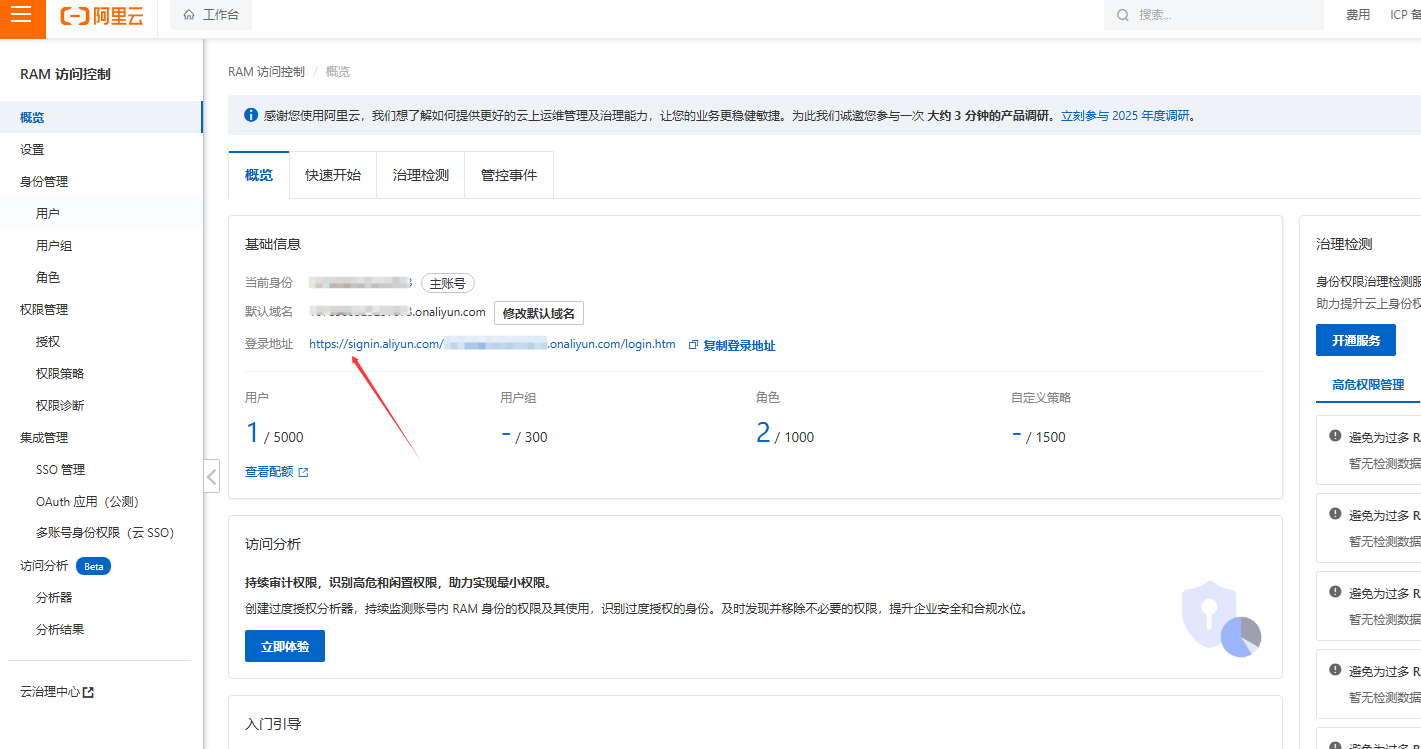 打开阿里云登录控制台,鼠标移到右上角头像,点击访问控制,进入RAM控制台,点击左侧身份管理-用户,创建用户